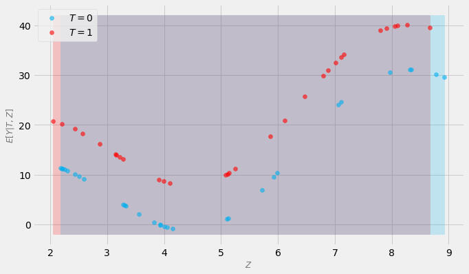 Subjects that got the treatment are marked in red. Subjects that did not get the treatment are marked in blue.Is the probability of each value of treatment greater than zero for each value of Z?Clearly not!So, what’s the problem here?In order to compare the outcomes of treated subjects with the outcomes of untreated subjects, we need to estimate the values for red dots in the blue area (where we have no treatment) and the values of the blue dots in the red area.Whatever model we use for this purpose, it will need to extrapolate.Take a look at the figure below that shows possible extrapolation trajectories (red and blue lines respectively):